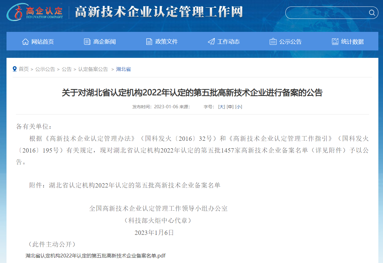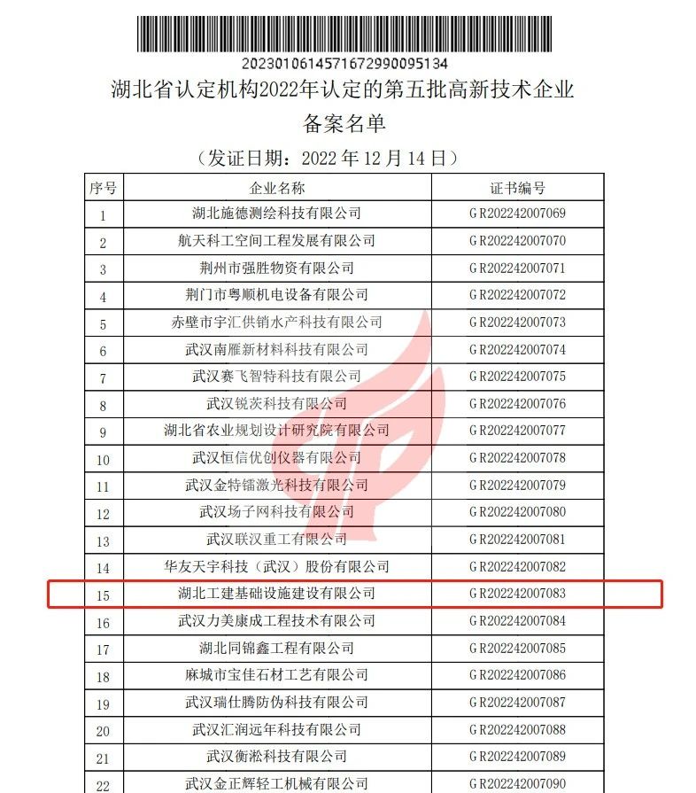 1月6日,全國高新技術企業認定管理工作領導小組辦公室發布《關于對湖北省認定機構2022年認定的第五批高新技術企業進行備案的公告》,湖北工建基礎設施公司榮登榜單。