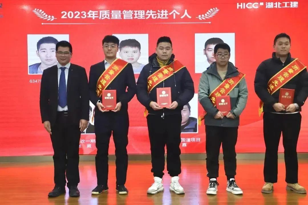 胡超宣讀了《關于表彰湖北工建基礎設施建設有限公司2023年度先進的決定》,公司領導班子成員依次為獲得2023年度“優秀團隊獎”“優秀供應商”“優秀經理獎”“優秀員工獎”“新人成長獎”“安全生產先進個人獎”“質量管理先進個人獎”的代表頒發榮譽證書和獎牌。
